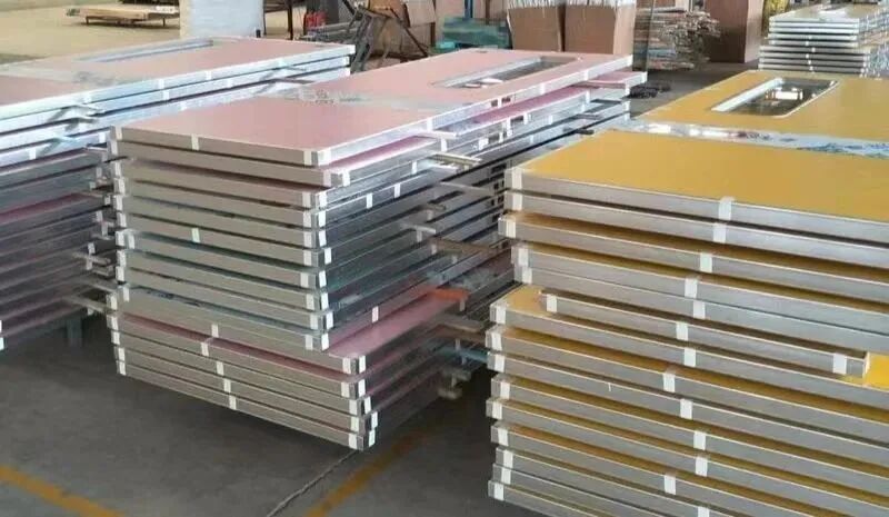 采用很好的冷轧钢板为基材,表面经过磷化处理、静电喷塑,内部填充很好的蜂窝纸、或铝蜂窝材料,通常门框1.2mm,门扇0.8mm,四周无铆钉,自咬合封装。