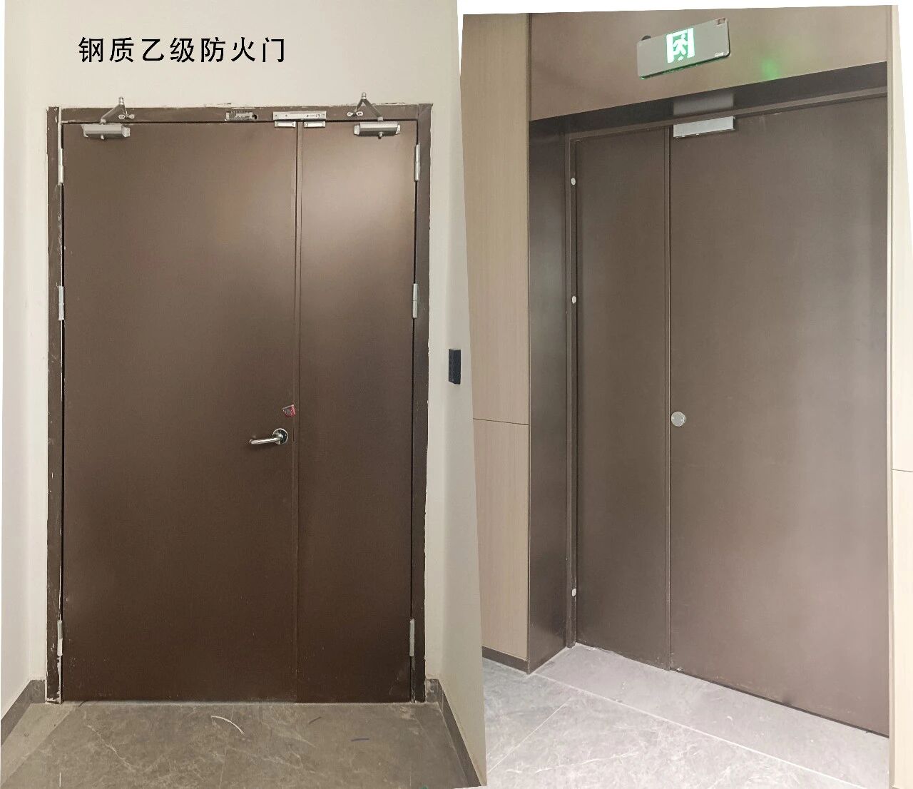 在消防通道中,为保障人员方便逃生,一般安装有钢质乙级防火门,搭配乙级单面拉手,耐火时长1小时,当防火门宽度超过1.1m,可做子母或双开,对于各种颜色,单开、子母、双开形式,胜捷泰安都可按需定制。